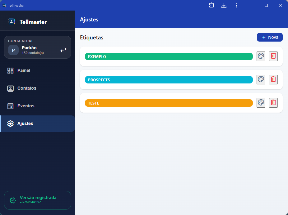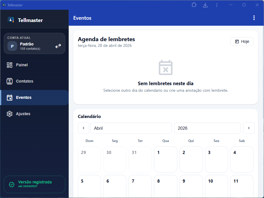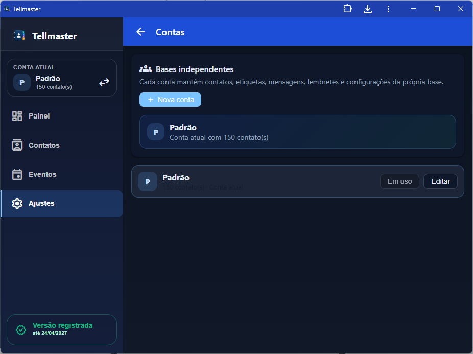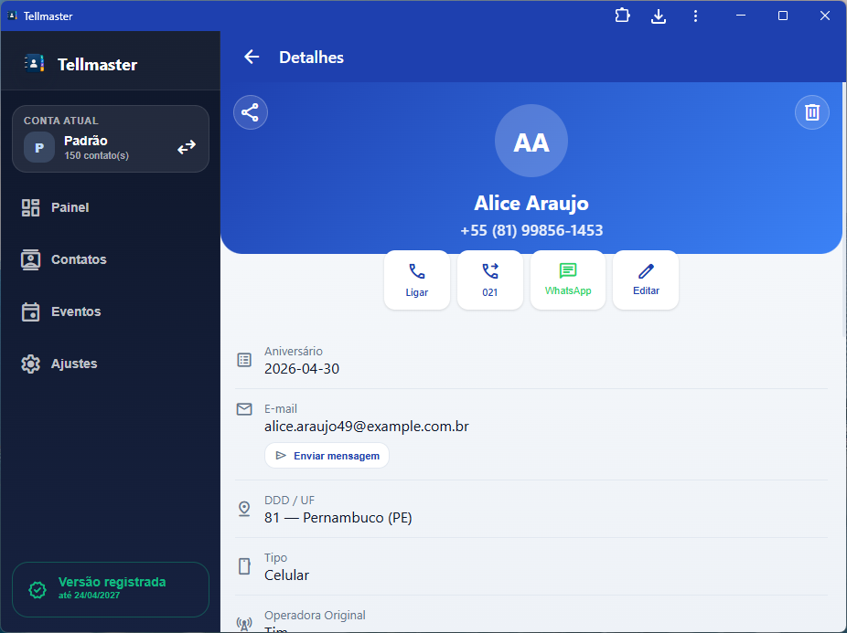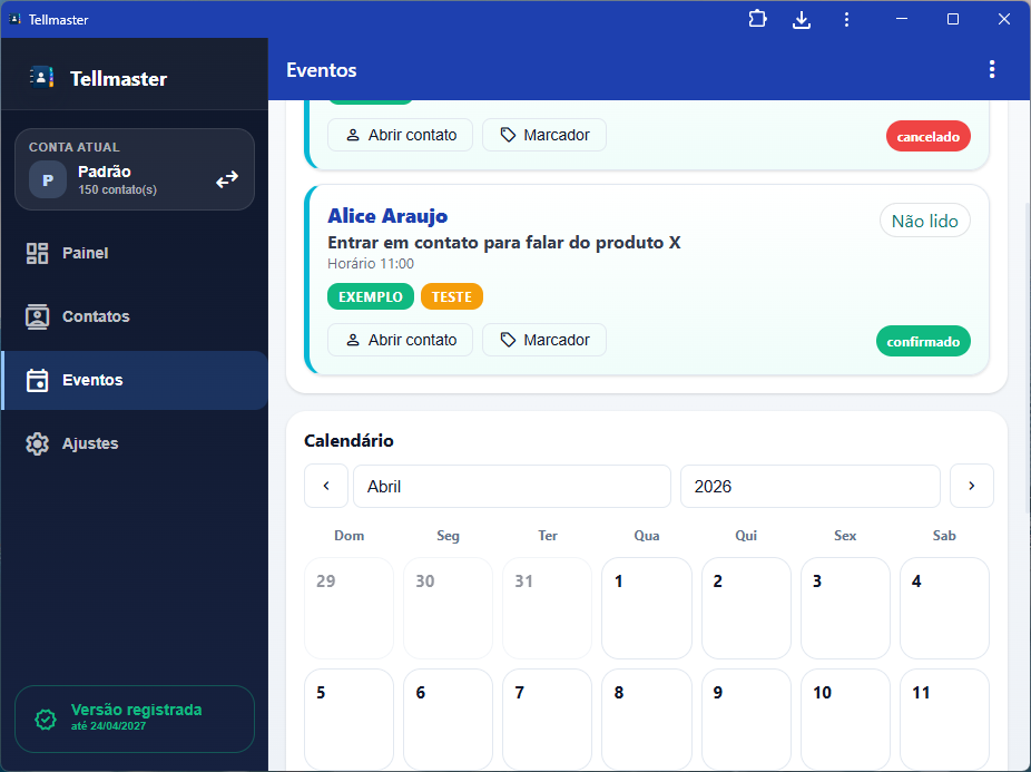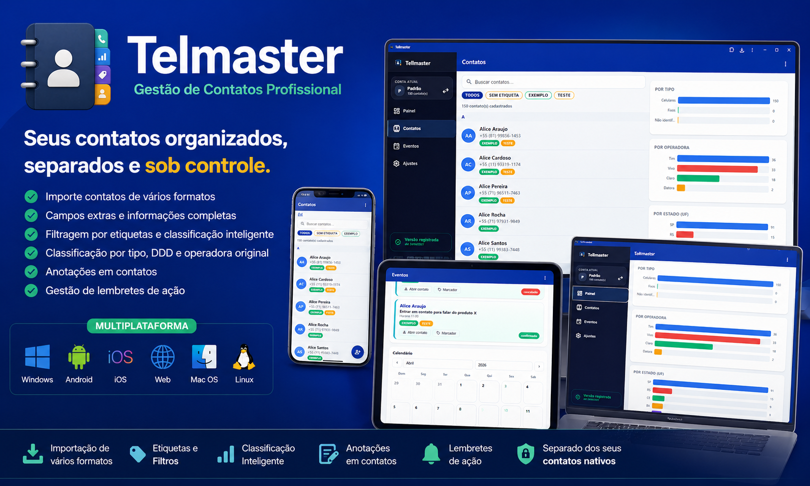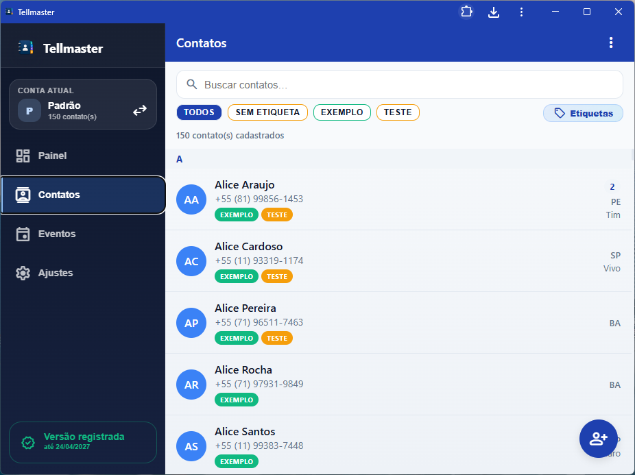 A proposta central você continuar com a agenda nativa do celular quieta, sem bagunçar tudo, e importa para o Telmaster apenas os contatos que quer trabalhar. A partir daí ganha organização por etiquetas, importação de várias fontes, filtros, anotações, lembretes, eventos, mensagens salvas, envio por WhatsApp/e-mail, operações em massa, exportação, backup, múltiplas contas e tem versão instalável em todos os dispositivos: Windows, Android, iOS, Web, Mac OS, Linux.