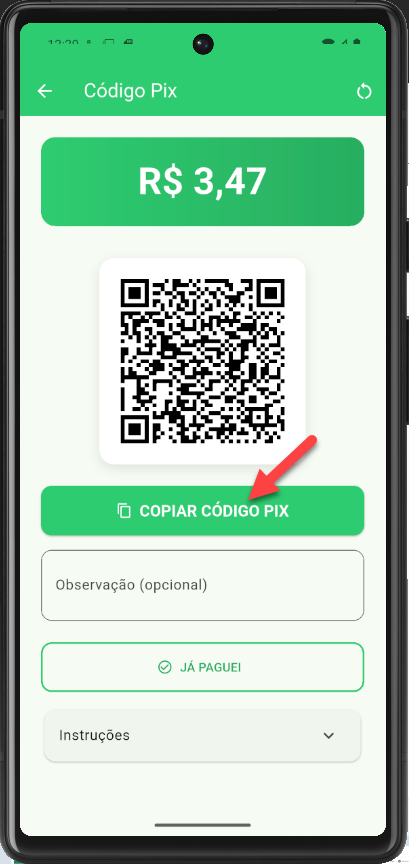 3- O sistema gera um código Pix. É só você copiar, alternar para o app do seu banco e pagar o valor. Sem risco de erro de digitação, sem demora. Pronto, resolveu!