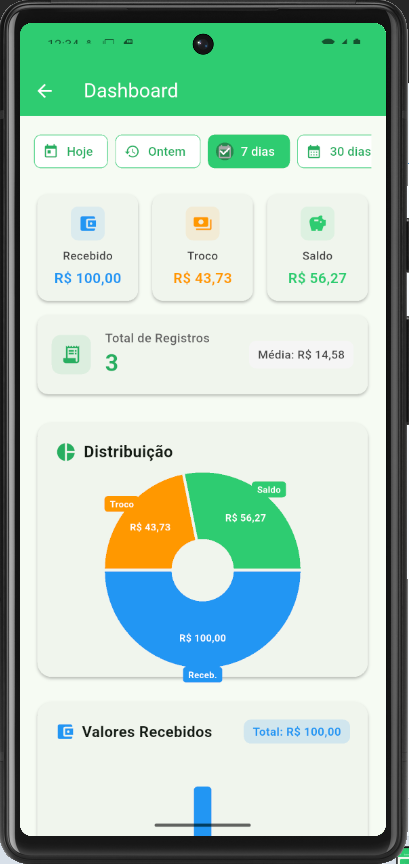 O app também guarda as informações dos trocos passados, gera relatório que pode ser exportado para Excel, HTML e outros formatos, gera um dashboard analítico com gráficos para você acompanhar tudo.