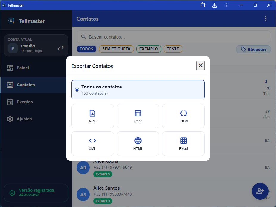 - Salve tudo ou contatos filtrados para Excel, texto, csv, json, xml, html;